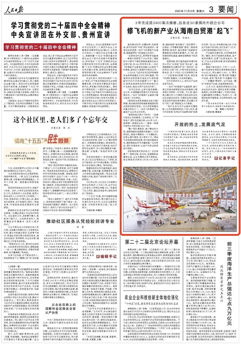 《人民日报》关注:修飞机的新产业从海南自贸港“起飞”