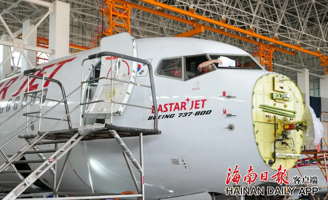 资料图:4月23日,在海南自贸港一站式飞机维修产业基地,工作人员正在检修一架韩国飞机。图源于海南日报