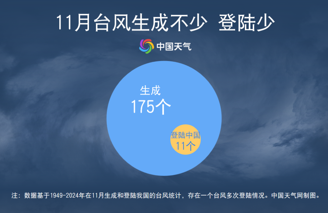中国天气网气象分析师周丽贤表示,如果“凤凰”最终登陆我国,也不算罕见,常年一直到12月还会有台风登陆我国。中国天气网统计1949年至2024年台风大数据发现,常年11月,在此期间生成的台风有175个,但登陆我国的个数较少,仅有11个。
