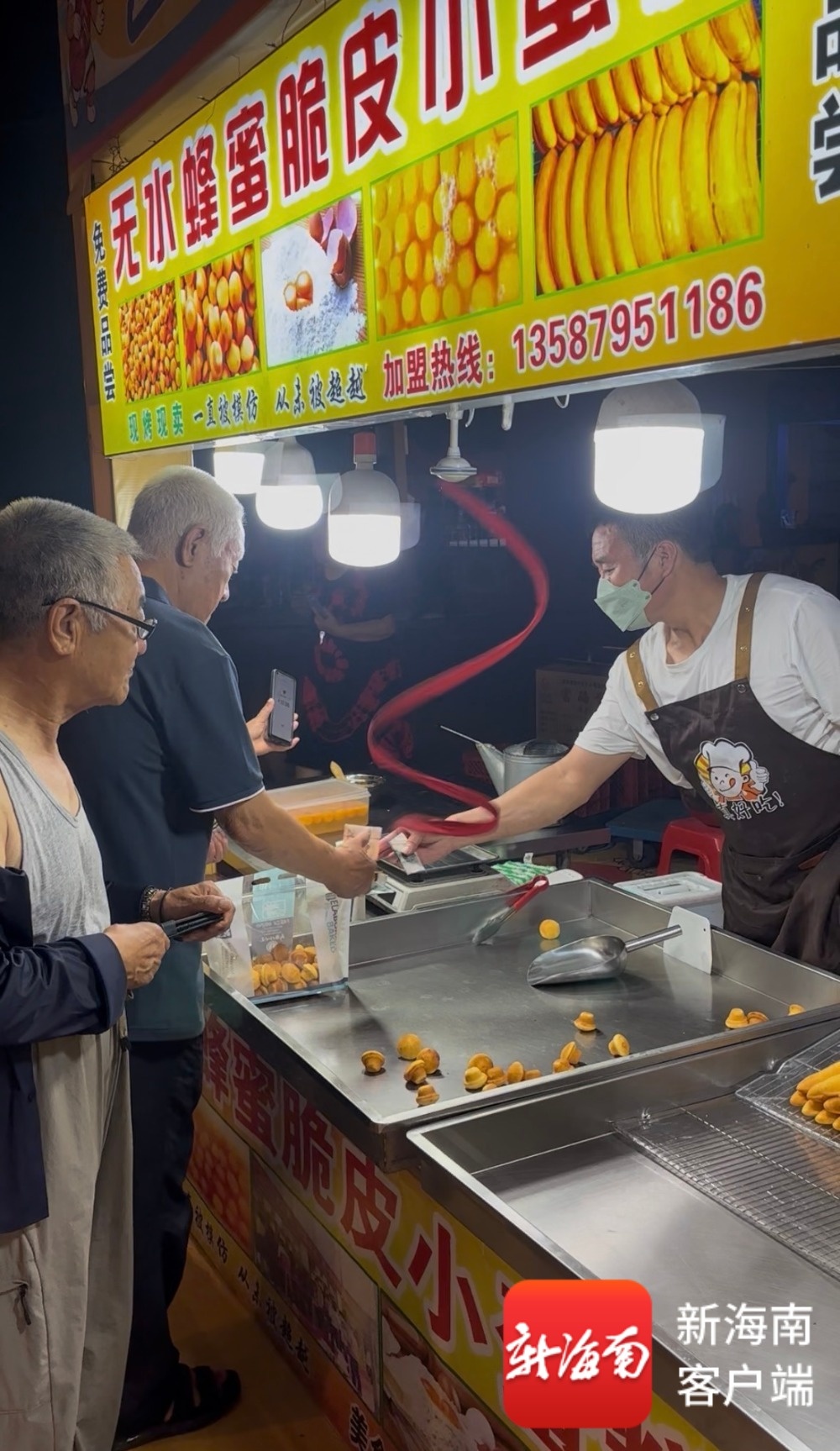 南海网、新海南客户端11月9日消息(记者 姚皓)在海南东方“村BA”人声鼎沸的赛场旁,激战的不只球场上的球员,还有美食市集里45岁的王晓军。他的“赛场”,是一个飘着甜蜜焦香的摊位;他的“绝杀”,是一颗颗刚出炉、热腾腾冒着蒸汽的无水蜂蜜小蛋糕。