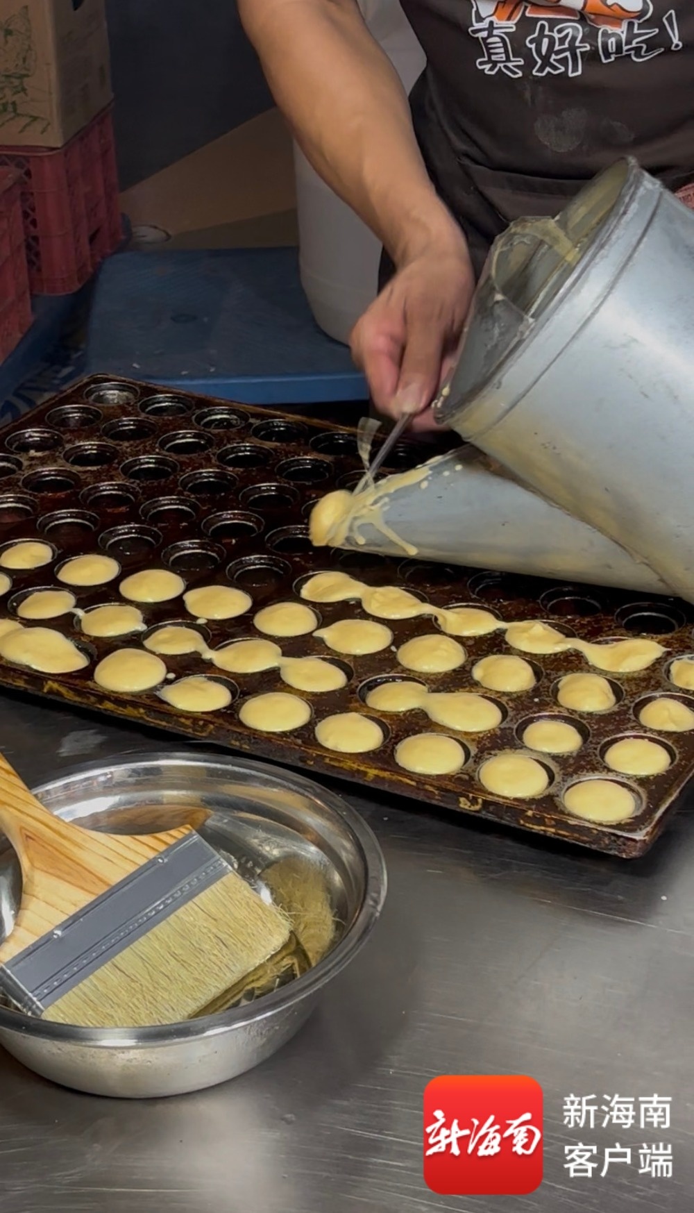 王晓军将蛋液倒入模具。记者 姚皓 摄