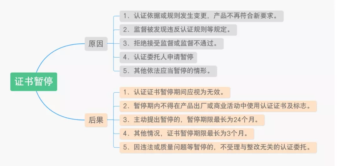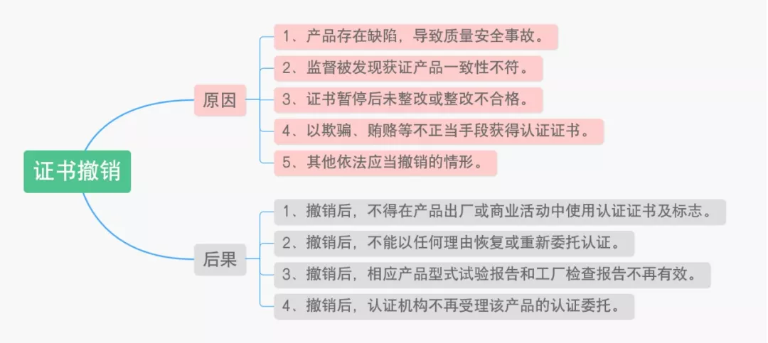 证书“撤销”状态:产品存在缺陷、监督不通过、证书暂停后整改不通过、获取认证手段不当等。撤销后不得使用认证证书、不能恢复或重新认证、试验报告无效。