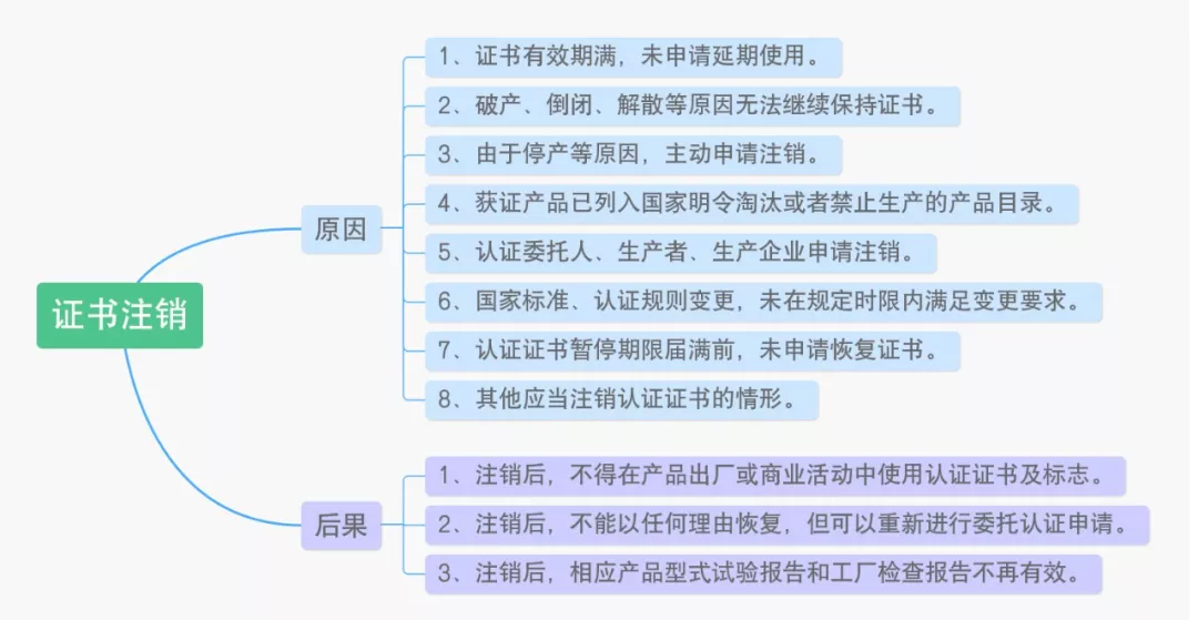 证书“注销”状态:证书有效期满未申请延期使用、厂家经营状况异常、产品停产或淘汰、暂停期满未恢复证书等。注销期间不得使用认证证书,注销后只能重新认证且型式试验报告失效;
