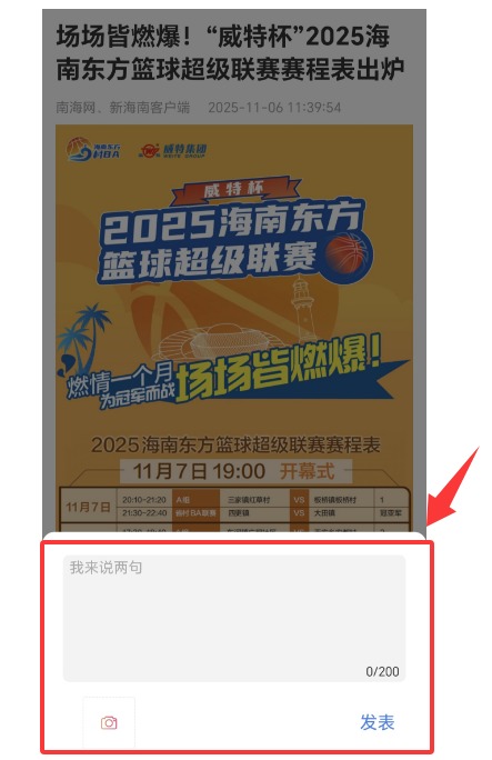 第一步:下载新海南APP,在客户端的任意一条当周海南东方“村BA”相关稿件下方,发表评论即可。