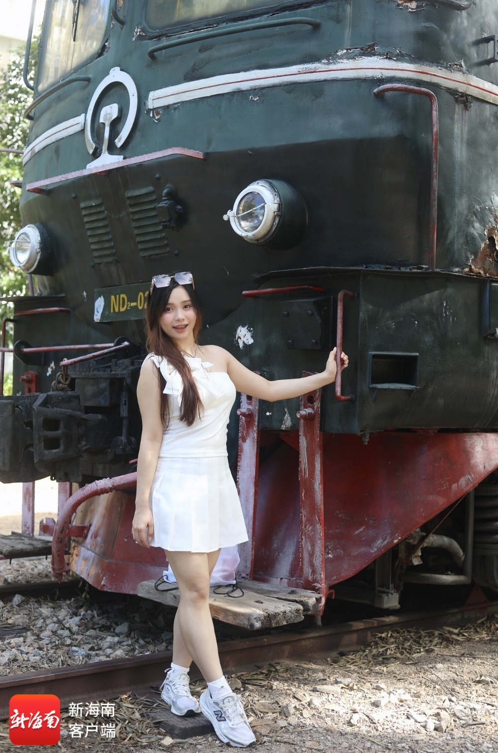 印度尼西亚Cecilia(曾小青)在海南铁路博物馆的内燃机车展品前拍照留念。