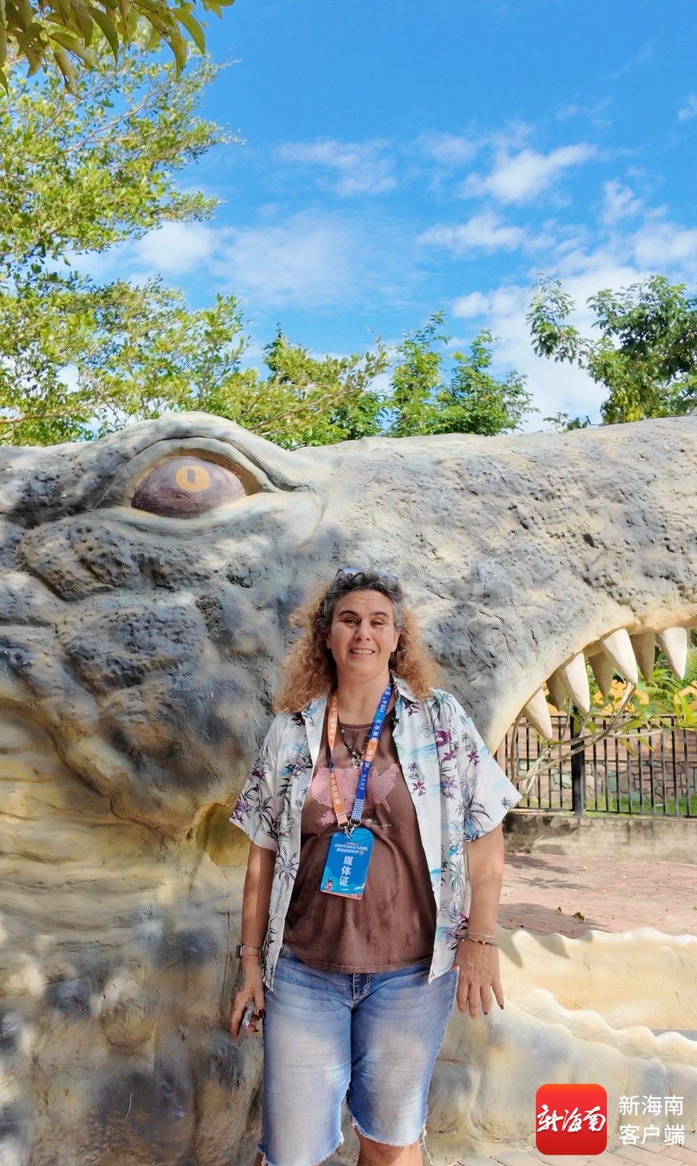 美国Marian Rosenberg(岳玫瑰)在鳄鱼小镇雕塑前拍照。