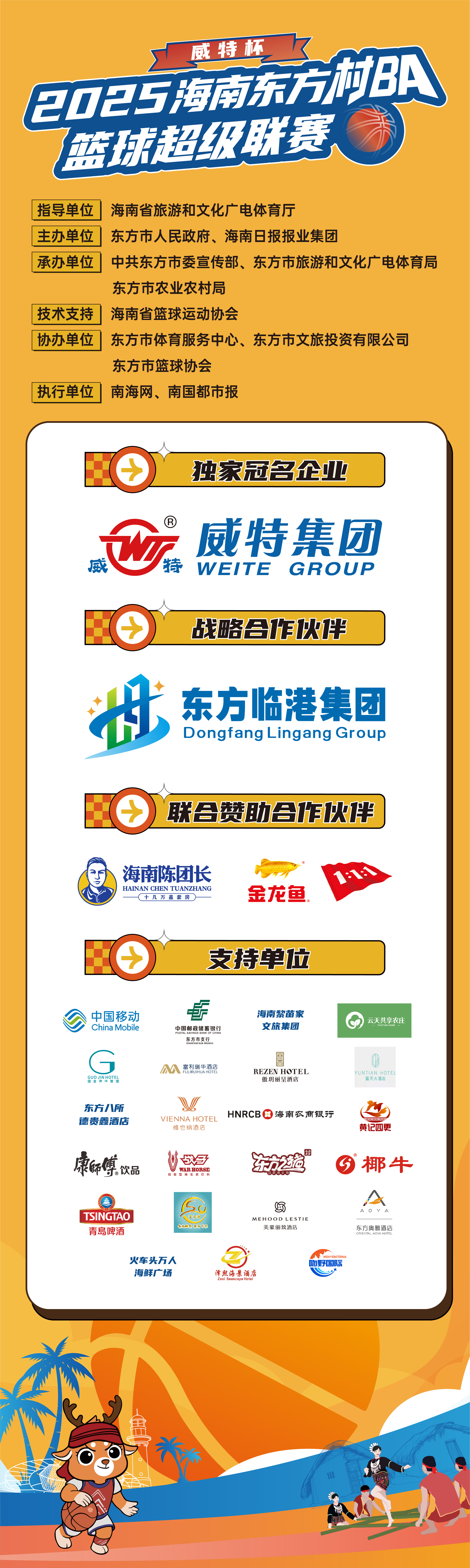 此次赛事独家冠名企业为海南威特电气集团有限公司,战略合作伙伴为东方临港产业园开发建设有限公司,联合赞助合作伙伴为海南陈团长、益海嘉里食品营销有限公司(金龙鱼1:1:1),该赛事还获得中国移动、火车头万人海鲜广场、中国邮政储蓄银行股份有限公司东方市支行、海南黎苗家文旅集团、云天共享农庄、东方国金酒店(原泰隆酒店)、富利瑞华酒店、东方傲玥丽呈酒店、云天大酒店、东方八所德贵鑫酒店、东方维也纳酒店、海南农村商业银行股份有限公司东方支行、黄记四更烤乳猪、康师傅饮品、战马饮料、深圳市东方之猪文化有限公司、椰牛椰汁集团、青岛啤酒股份有限公司、山东齐食源食品有限公司、美豪·丽致酒店、东方奥雅国际酒店、泽熙海景酒店姜姐旅租、吻野(海南)食品有限公司等企业的大力支持。