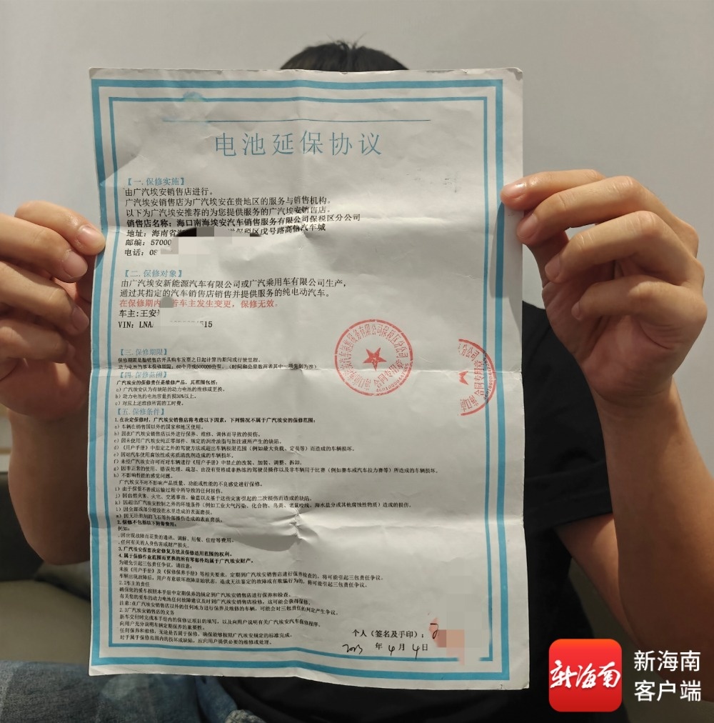 王先生告诉记者,2023年4月4日,自己在海口广汽埃安汽车销售服务有限公司保税区分公司购买了一辆纯电轿车。今年9月11日,车辆充满电后行驶不到200公里就显示电量不足。“车辆标注的续航里程是510公里,开了不到200公里就没电肯定不正常。”王先生将车送到4S店进行检修。