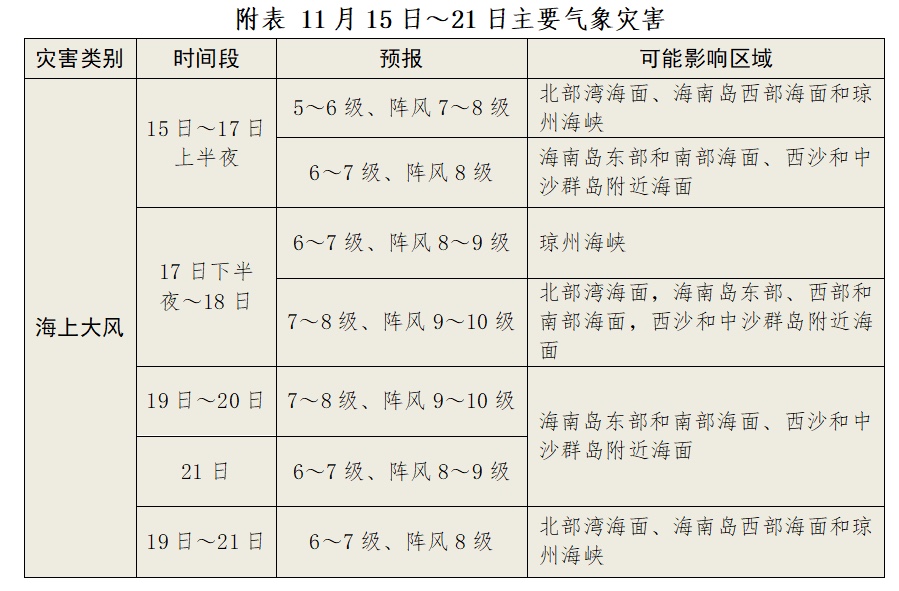 11月15日~17日上半夜,北部湾海面、海南岛西部海面和琼州海峡,风力5~6级、阵风7~8级;海南岛东部和南部海面、西沙和中沙群岛附近海面,风力6~7级、阵风8级;南沙群岛附近海面,风力5~6级、阵风7级。