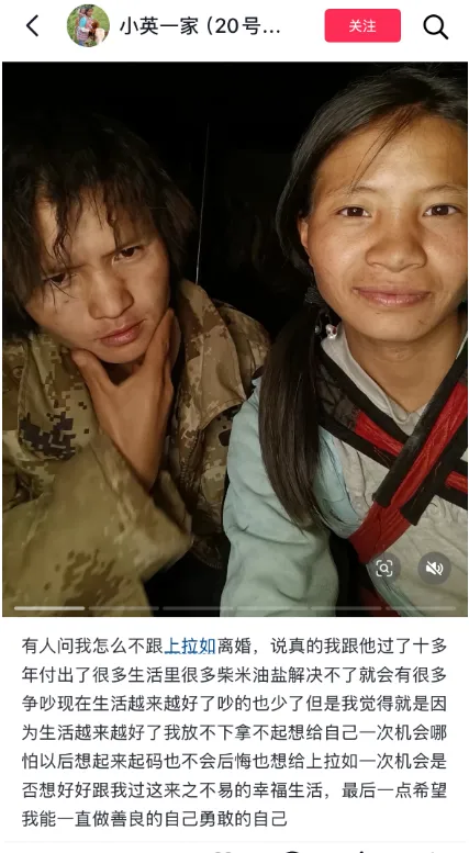 2025年4月26日,网红“小英一家”发文回应为何不和老公“上拉如”离婚。