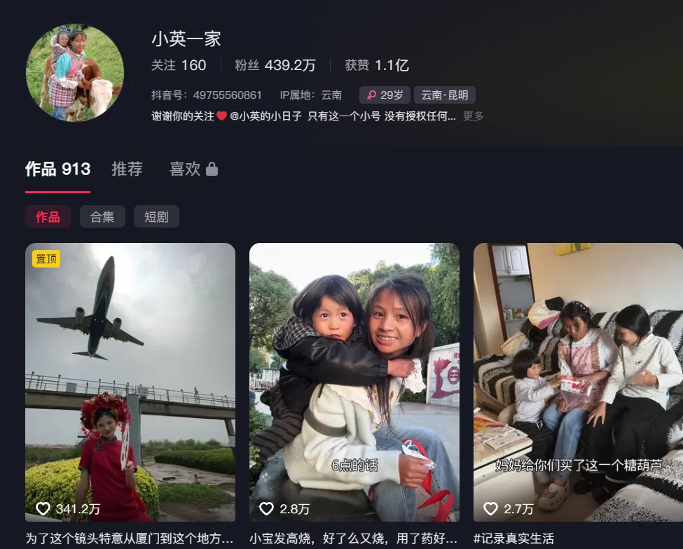 据介绍,小英原名杨早英,出生于1996年,是自媒体账号“小英一家”所有者,她以记录云南农村生活走红。2022年10月19日,“小英一家”在抖音上发布了第一个作品。截至发稿,“小英一家”在抖音平台已有439.2万粉丝。