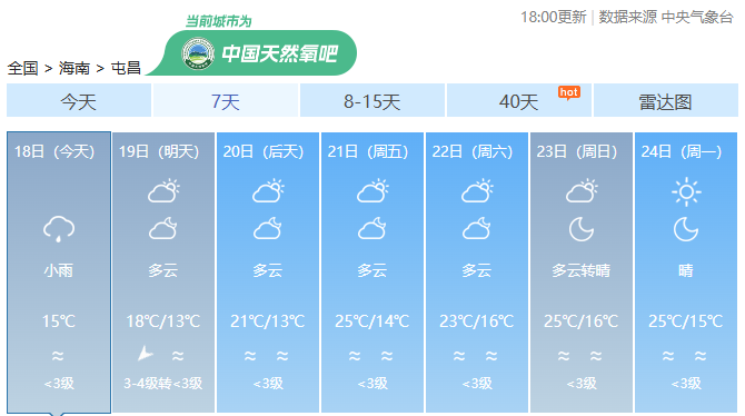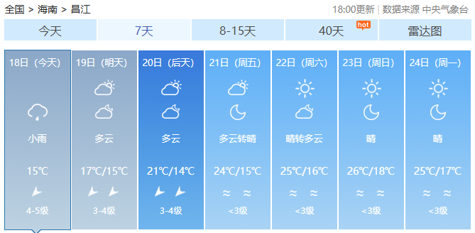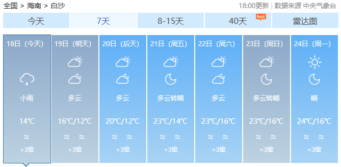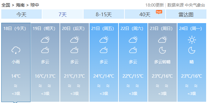 预计,18日夜间至19日夜间,海南岛五指山以北地区将出现小雨,最高气温五指山以北地区19~22℃,五指山以南地区23~25℃,最低气温中部山区和西部内陆地区13~15℃,其余地区16~18℃。