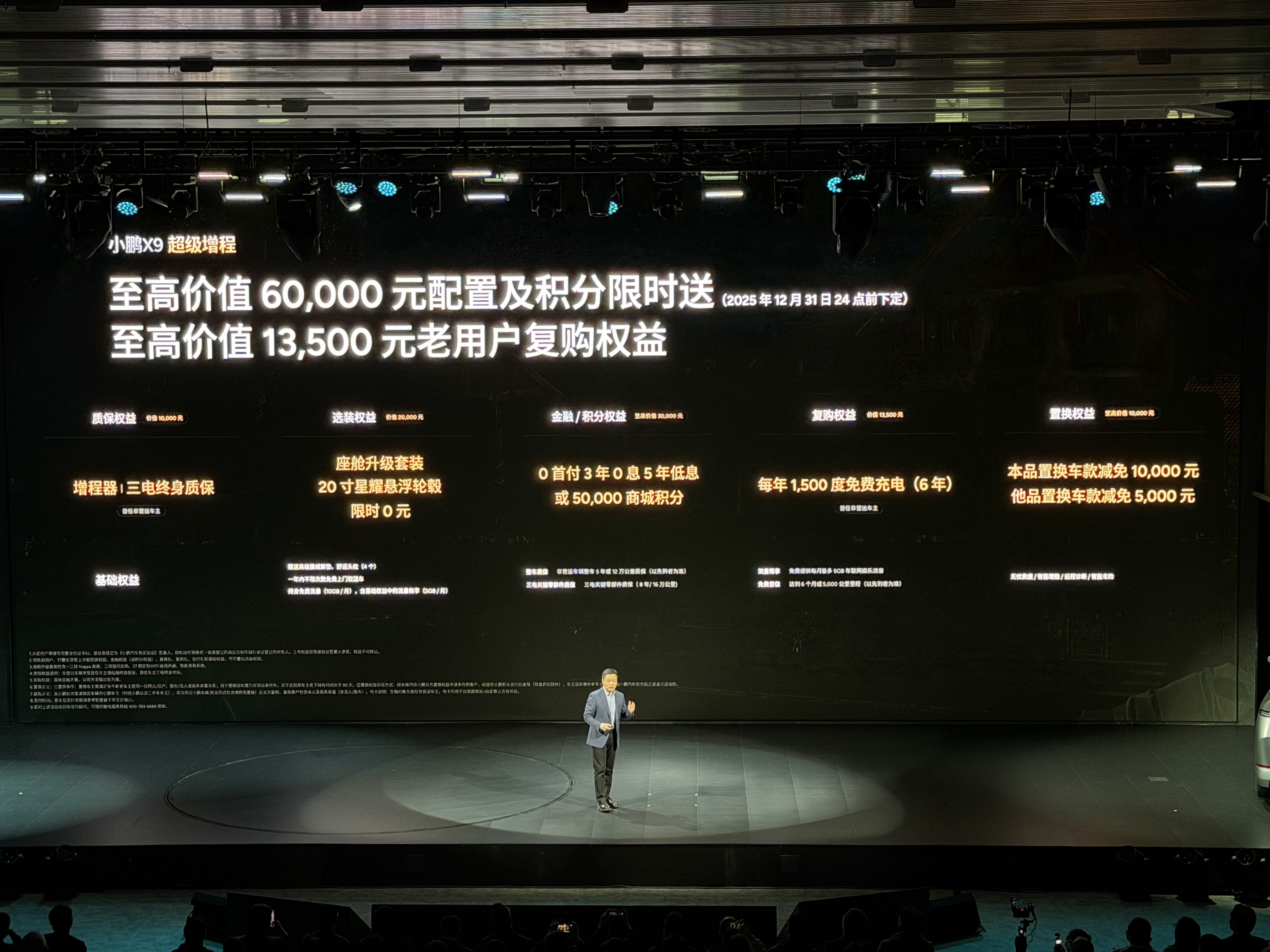 为提升产品市场吸引力,小鹏汽车同步推出上市专属权益,活动时间为即日起至2025年12月31日24点,在此期间下定的用户可享受至高价值60000元的配置及积分权益。具体来看,权益涵盖三大板块:一是增程器和三电系统终身质保,价值10000元,为用户提供长期用车保障;二是座舱升级套装与20寸星耀悬浮轮毂选装权益限时免费,两项配置原价值20000元,可直接提升车辆质感;三是金融及积分二选一权益,至高价值30000元,用户可选择“0首付3年0利息”“5年低利息”金融方案,或兑换50000商城积分。