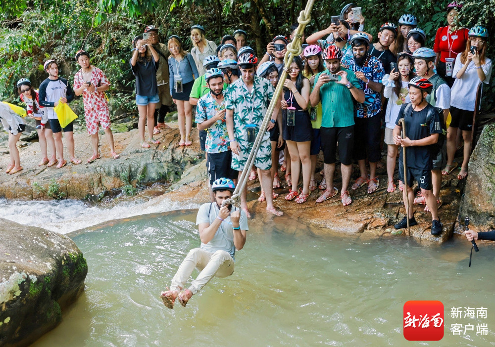 海南旅游国际推荐官在呀诺达热带雨林体验溯溪。记者 李昊 摄