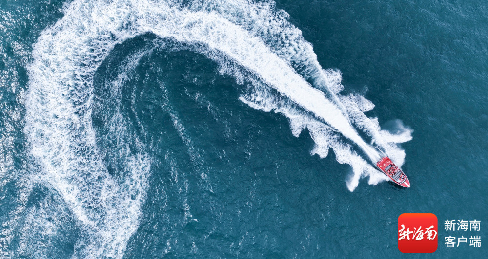 海南旅游国际推荐官在三亚蜈支洲岛乘坐“动感飞艇”,感受水上运动的激情与活力。记者 李昊 摄