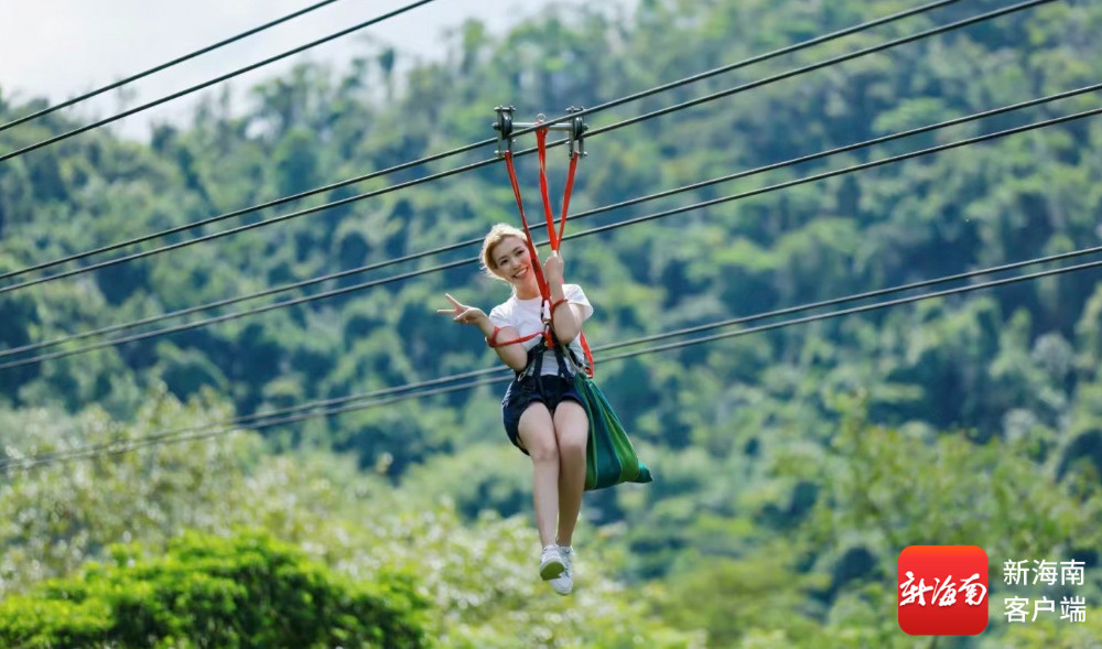 海南旅游国际推荐官安妮在呀诺达体验高空滑索。记者 李昊 摄