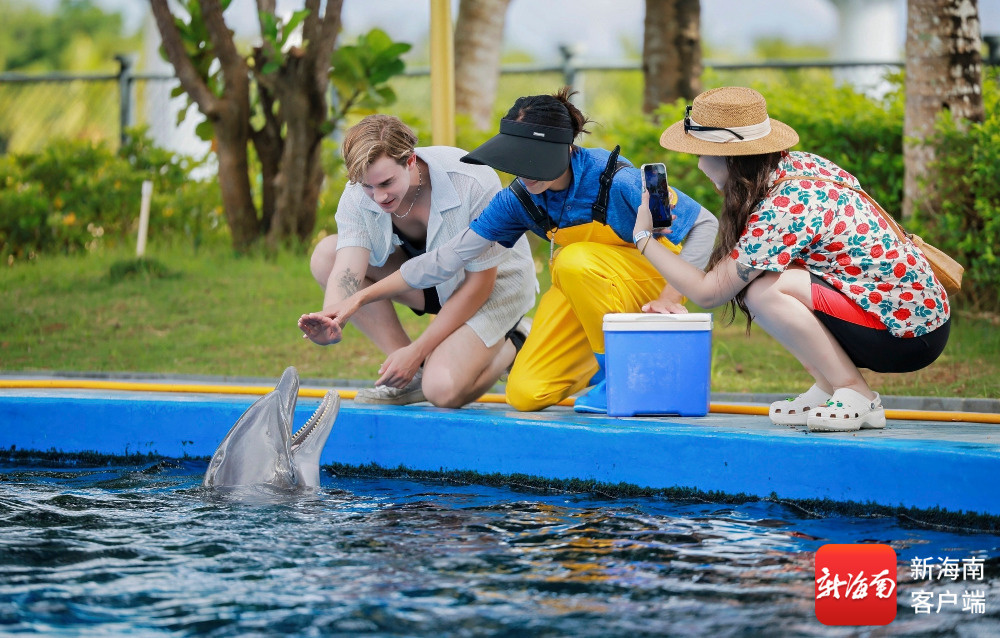 海南旅游国际推荐官在海南热带海洋欢乐世界与海豚互动。记者 李昊 摄
