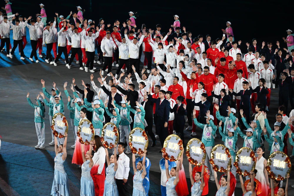 ——欢笑伴着汗水,拼搏成就梦想,1.4万余名健儿共赴四年之约,在竞技舞台攀越高峰,写下新中国体育发展史上又一页华彩篇章。