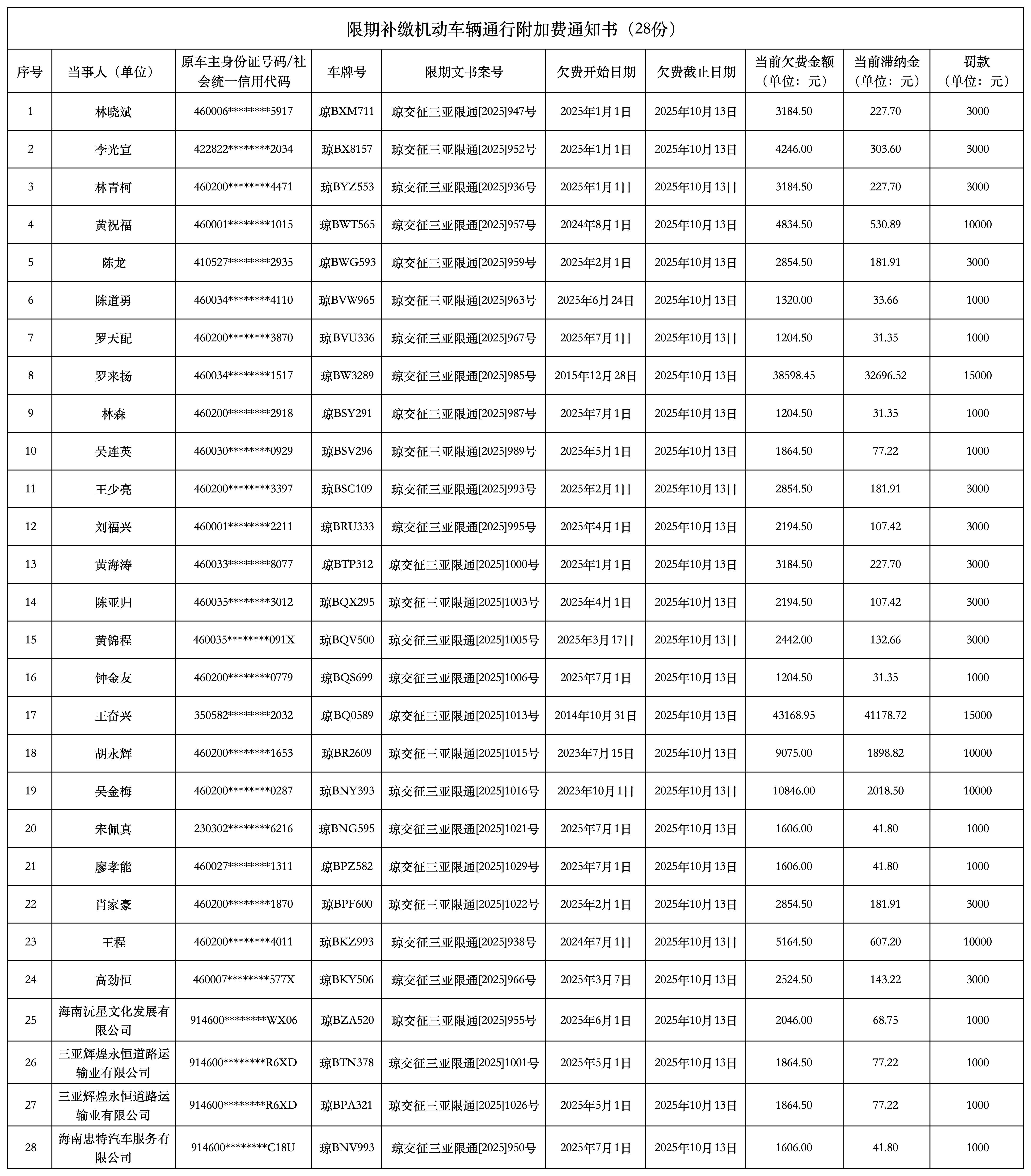 根据《海南经济特区机动车辆通行附加费征收管理条例》第二十六条之规定,现责令你(单位)补缴通行费及滞纳金(详见附表3)。