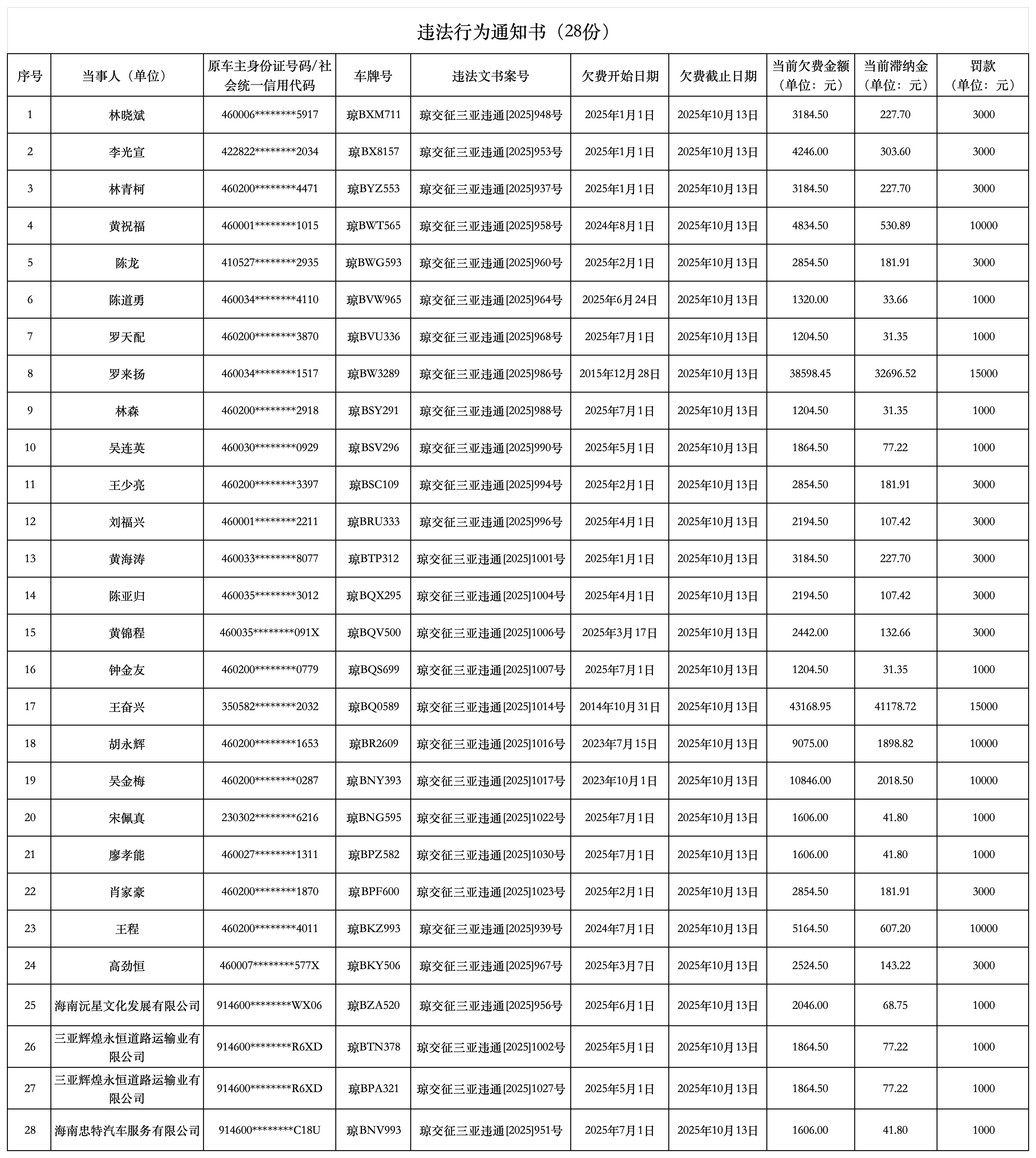 根据《中华人民共和国行政处罚法》第二十八条:“行政机关实施行政处罚时,应当责令当事人改正或者限期改正违法行为”之规定,责令你(单位)在本公告送达之日起15个工作日内改正违法行为,并到海南省三亚市吉阳区凤凰路123号(海南省交通规费征稽局三亚分局)处开具《海南省非税收入一般缴款书》,并按《海南省非税收入一般缴款书》要求进行缴款。