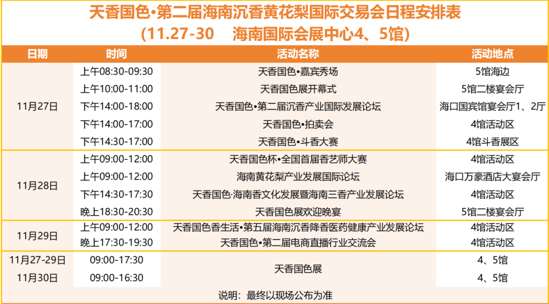 在展会期间,多国商务考察团将赴海南多个市县进行考察,深入海南沉香种植基地、加工生产企业等地考察。组委会还将举办产业产品推介会、“香木之夜”主题晚会、天香国色红人馆线上直播节、沉香黄花梨非遗表演、珠串创意设计大赛等精彩配套活动,充分展现沉香黄花梨产业多元化与创新活力。