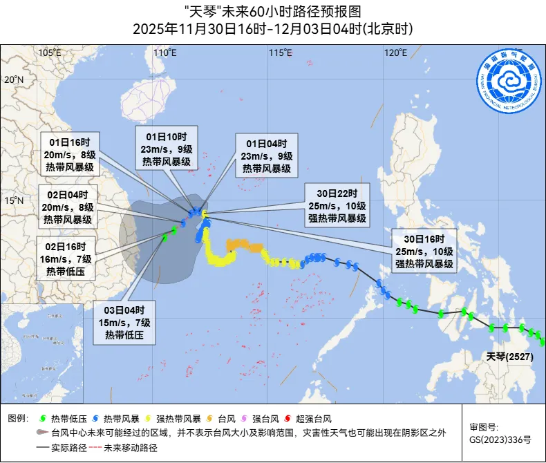 海南省气象局2025年11月30日17时00分继续发布台风四级预警(海上):台风 “天琴”(强热带风暴级),16时中心位于北纬14.3度、东经112.3度,也就是在三沙市永兴岛偏南方向约280公里的南海海面上,中心附近最大风力10级(25米/秒),七级风圈半径160-200公里。