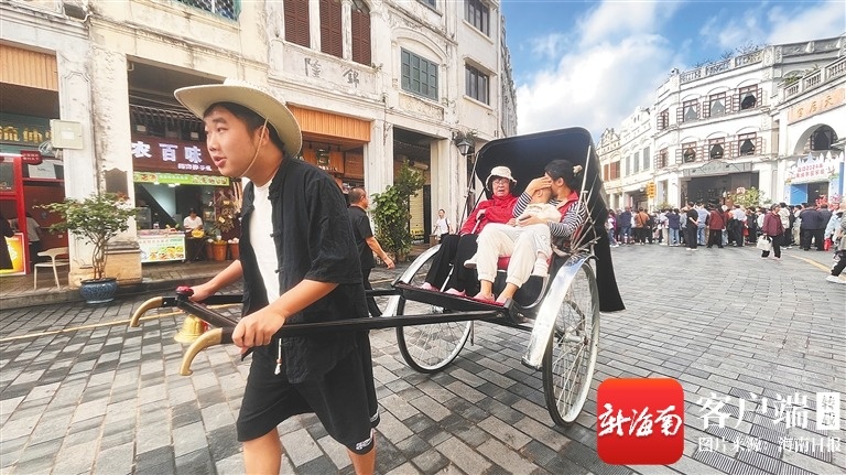 游客在海口市中山路骑楼老街坐“黄包车”。海南日报全媒体记者 张茂 摄