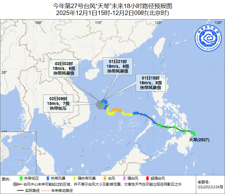 预计,“天琴”将在南海中西部海面回旋少动,2日将向西南方向缓慢移动,并在南海西南部海域逐渐减弱消散。