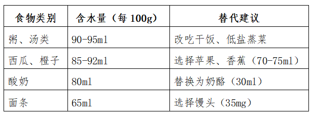 ▲注意:这里的“水分”不仅指白开水,还包括:液体类(汤、粥、牛奶、饮料、果汁),高水分食物(西瓜、黄瓜、橘子、酸奶等),隐形水分(米饭、面条、蔬菜中的水分)。