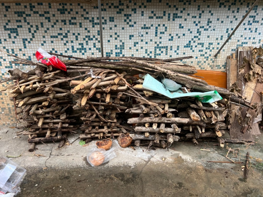 据钱女士介绍,涉事业主在小区公共绿地内私自搭建木头房子和木质架子,不仅圈占绿地种菜,还在搭建物内生火煮鸡食、违规养鸡。该业主并非一楼住户,而是居住在三楼,却在她家阳台外墙下方常年堆放大量烧火木材,地面散落不少烟头。