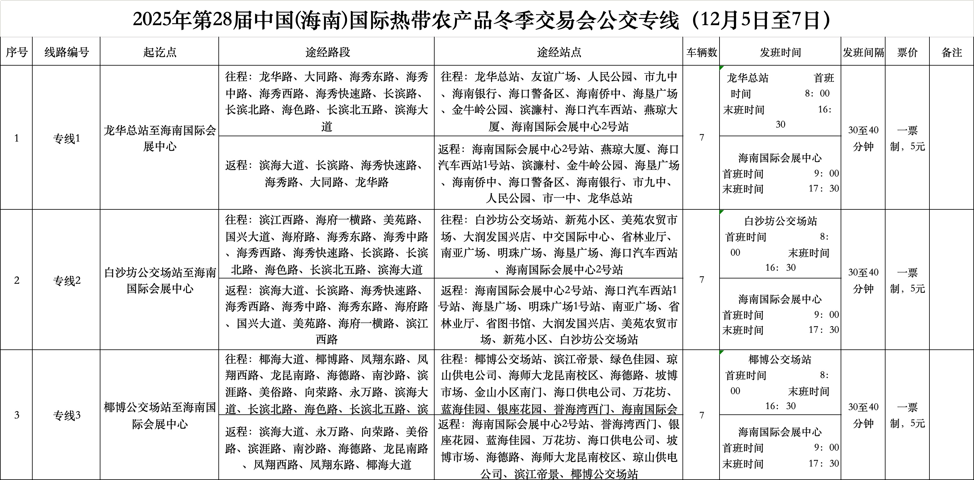 据了解,为方便市民游客前往冬交会现场,海口公交开通专线1(龙华总站至海南国际会展中心)、专线2(白沙坊公交场站至海南国际会展中心)、专线3(椰博公交场站至海南国际会展中心)等3条冬交会公交专线。保障时间为市区始发站首班8:00、末班16:30,海南国际会展中心首班 9:00、末班17:30,发车间隔为每班30-40分钟,根据实时客流动态发班,票价实行一票制5元。