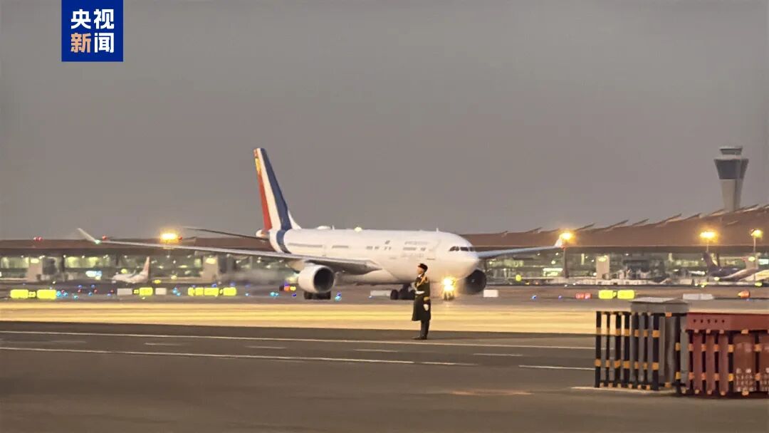 12月3日下午,法国总统马克龙乘机抵达北京首都国际机场,开启为期三天的访华之行。(来源:央视新闻)