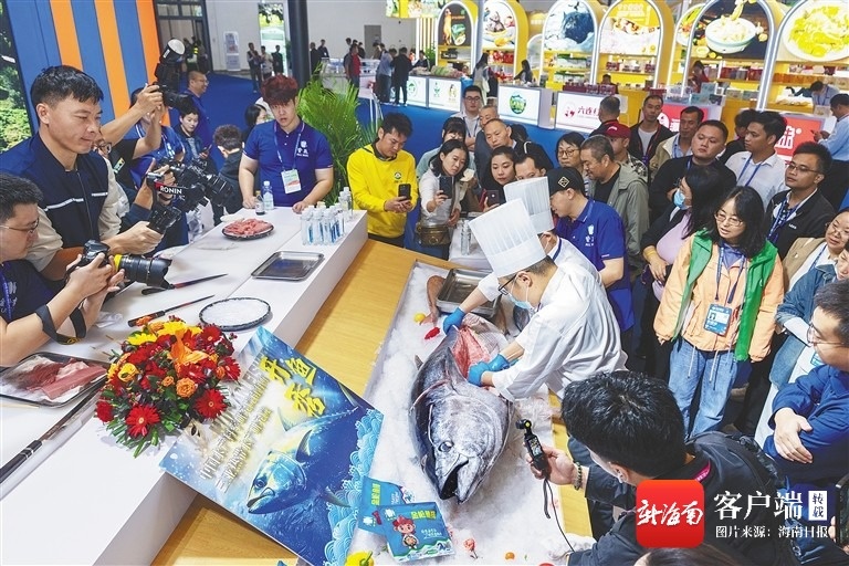 12月4日,在冬交会现场的海南渔业展区,重约120斤的金枪鱼开鱼秀吸引逛展观众的关注。海南日报全媒体记者 袁琛 摄