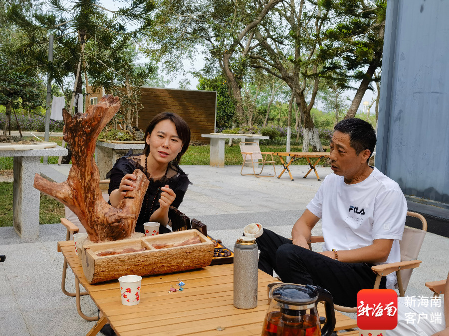 东方市云天投资集团有限公司总裁王经丽向郭海山讲解黄花梨的用途及文化传承。记者 李绍远 摄