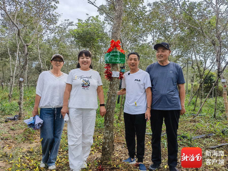 郭海山(右二)与家属同海南东方“村BA”锦鲤大奖三等奖黄花梨树合影。记者 李绍远 摄