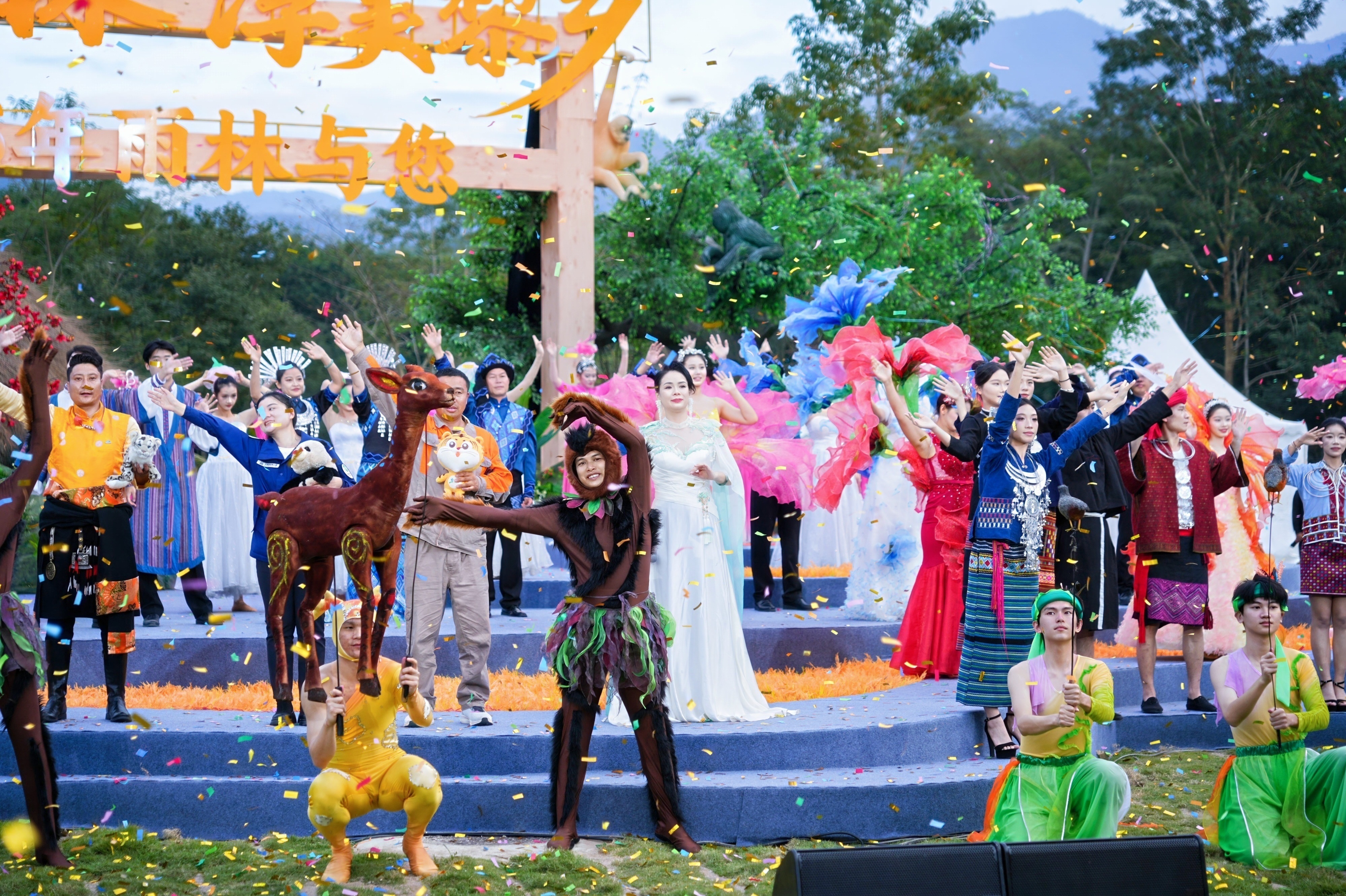 置身于群山合抱的自然剧场,以苍翠青山为幕,以和煦的日光为灯,这场演出将观众带入了热带雨林的生命现场。
