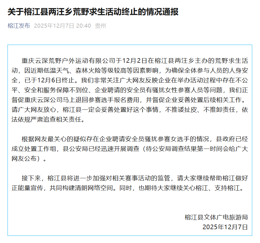 重庆云深荒野户外运动有限公司于12月2日在榕江县两汪乡主办的荒野求生活动,因近期低温天气、森林火险等级较高等因素影响,为确保全体参与人员的人身安全,已于12月6日终止。我们非常关注广大网友反映企业在举办活动过程中存在不公平、安全和服务保障不到位、企业聘请的安全员有骚扰女性参赛人员等问题,我们正督促重庆云深公司马上退回参赛选手报名费用,并督促企业妥善处置后续相关工作。请广大网友放心,榕江县一定会妥善处置好这个事情,不推诿扯皮、不推卸责任,依法依规严肃追查相关责任。根据网友最关心的疑似存在企业聘请安全员骚扰参赛女选手的情况,县政府已经成立处置工作组,县公安局已经迅速开展调查(待公安局调查结果第一时间会给广大网友公布)。接下来,榕江县将进一步加强对相关赛事活动的监管,请大家继续帮助榕江做好正能量宣传,共同构建清朗网络空间。同时,也期待大家继续关心榕江、支持榕江。