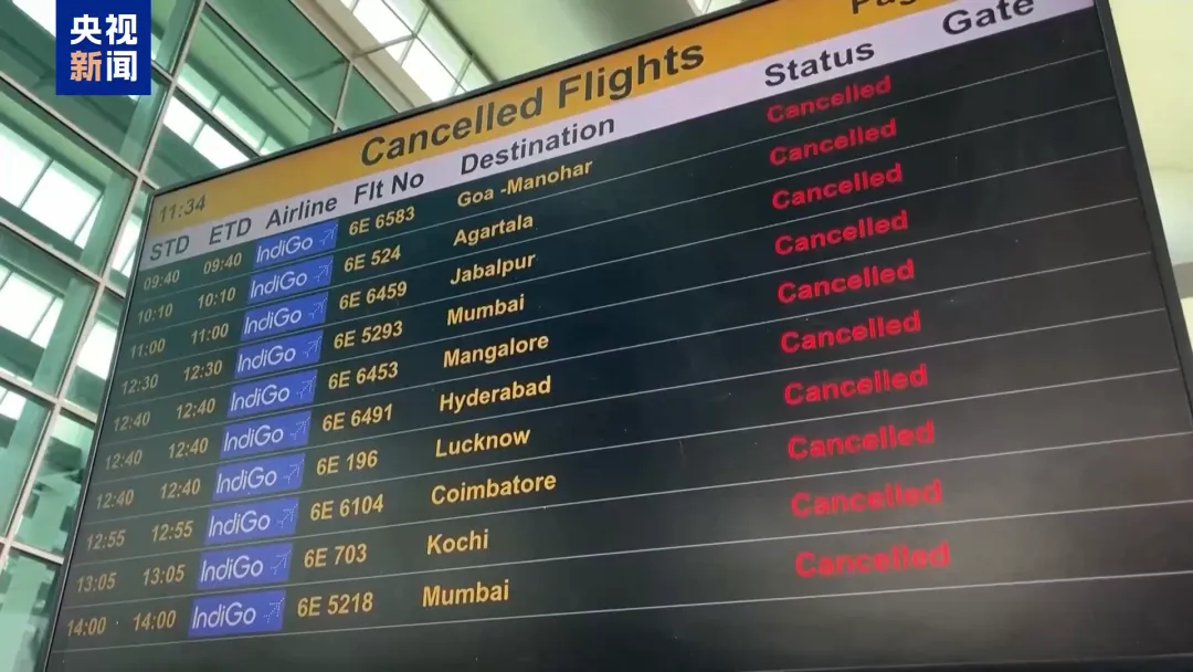 因印度政府颁布新规导致飞行员排班困难等问题,印度靛蓝航空公司连续5天取消航班数千架次,导致大量乘客滞留机场。(来源:央视新闻)