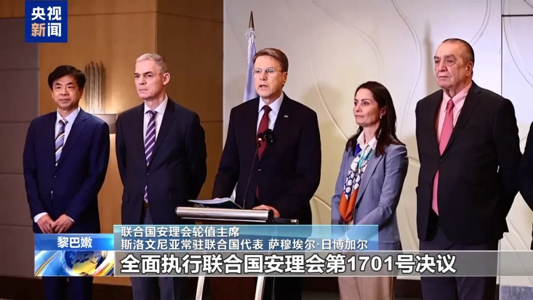 当地时间12月6日下午,联合国安理会代表团在黎巴嫩访问期间举行记者发布会,重申安理会支持黎巴嫩的安全稳定和全面执行第1701号决议的承诺。(来源:央视新闻)