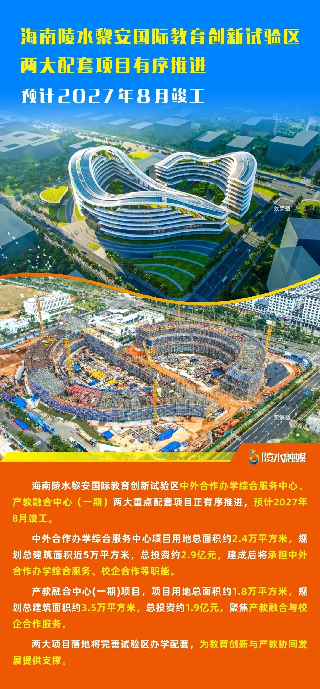 海南陵水黎安国际教育创新试验区中外合作办学综合服务中心、产教融合中心(一期)两大配套项目有序推进,预计2027年8月竣工。(来源:陵水发布)