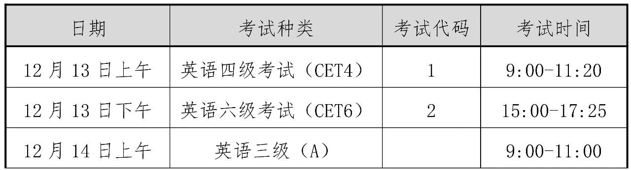 据了解,英语四级考试(CET4)将于12月13日9:00-11:20进行,英语六级考试(CET6)将于12月13日15:00-17:25进行;高等学校英语应用能力考试(AB级)将于12月14日9:00-11:00进行。