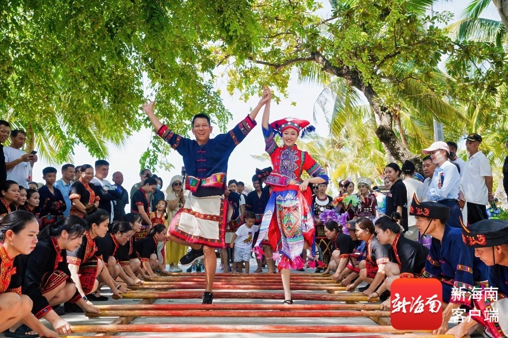 游客在天涯海角游览区观看黎族打柴舞演出。天涯海角游览区供图