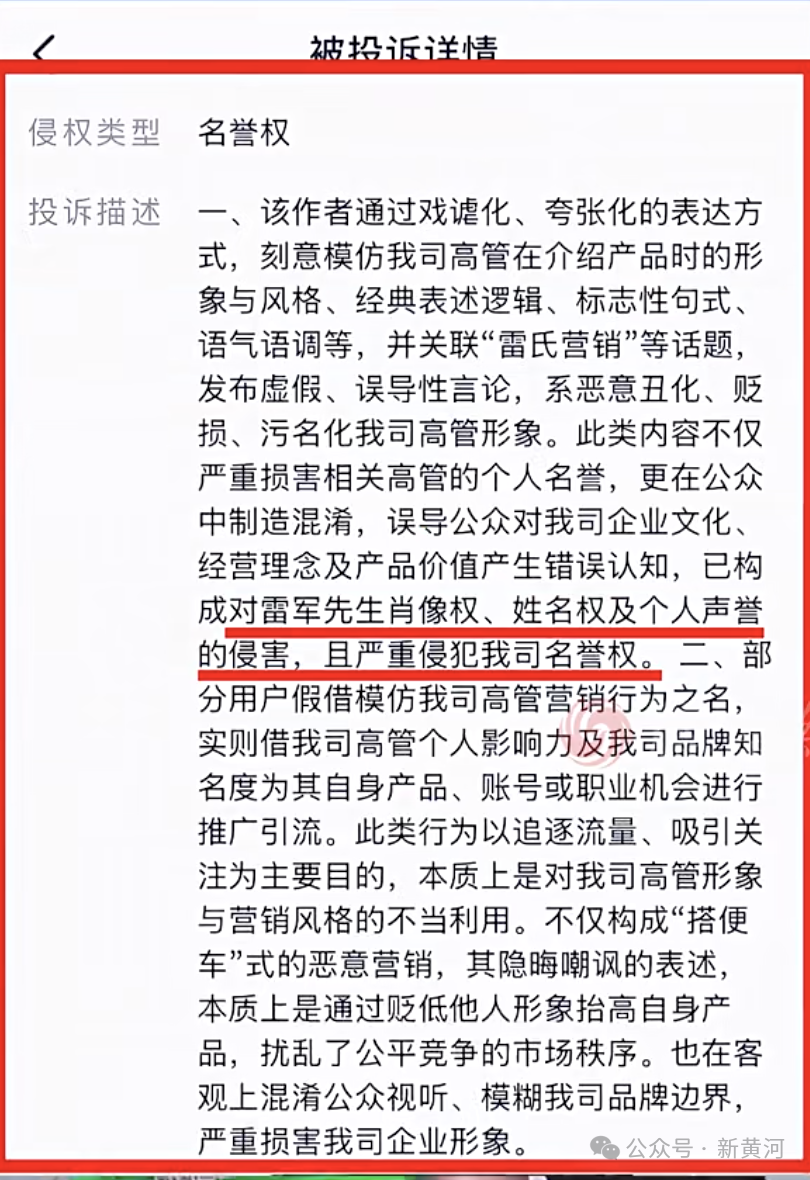 12月10日,山东威海一村支书网上卖谷物小米,被小米法务以“关联雷氏营销”“丑化小米高管形象”投诉下架视频,称刻意模仿小米公司高管在介绍产品时的形象风格、经典表述、标志性句式、语气语调等。