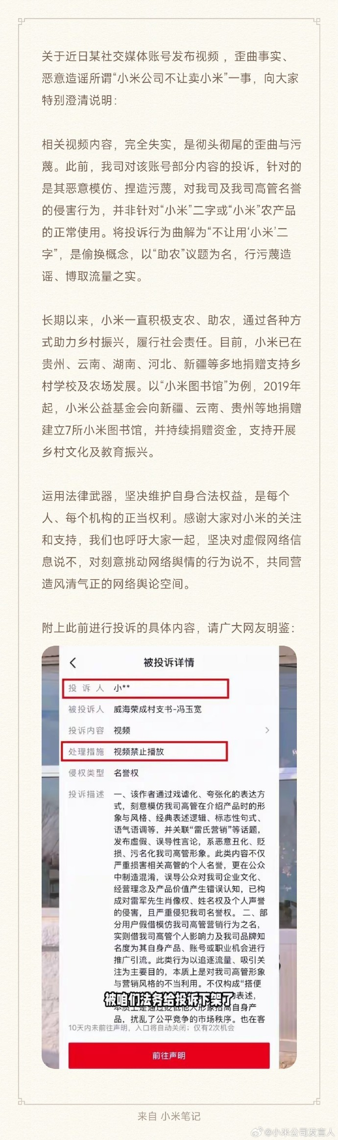相关视频内容,完全失实,是彻头彻尾的歪曲与污蔑。此前,我司对该账号部分内容的投诉,针对的是其恶意模仿、捏造污蔑,对我司及我司高管名誉的侵害行为,并非针对“小米”二字或“小米”农产品的正常使用。将投诉行为曲解为“不让用‘小米’二字”,是偷换概念,以“助农”议题为名,行污蔑造谣、博取流量之实。