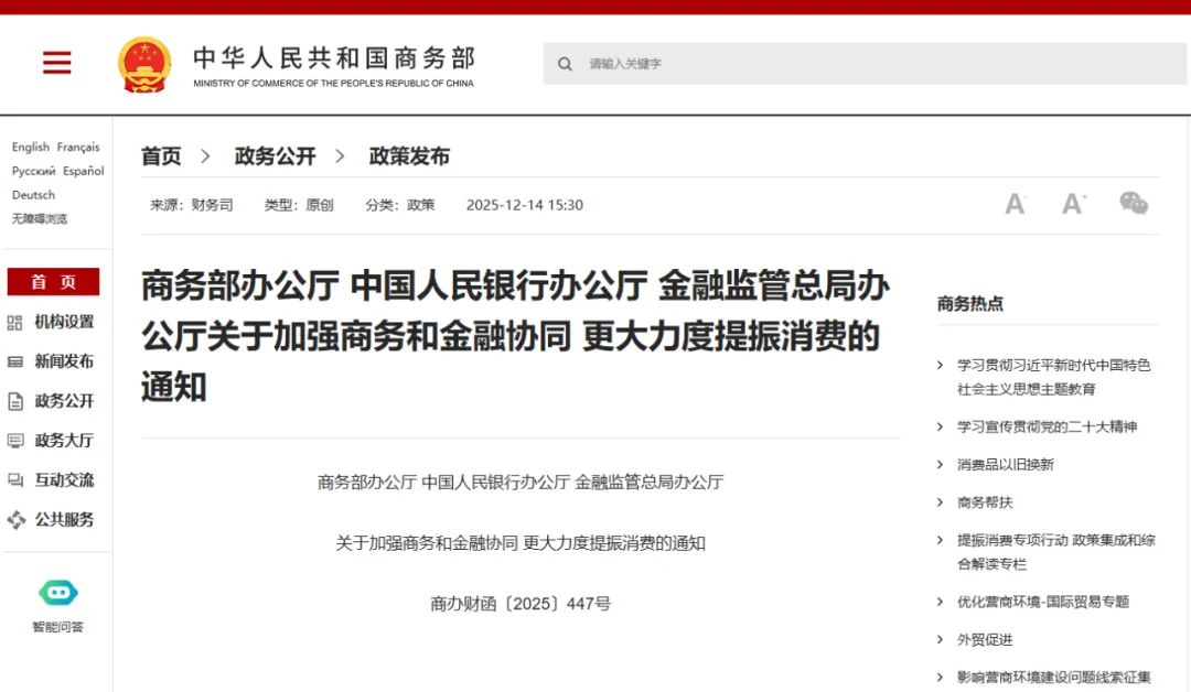 商务部、中国人民银行、金融监管总局三部门日前发文,要求加强商务和金融协同,更大力度提振消费。(来源:商务部官方网站)