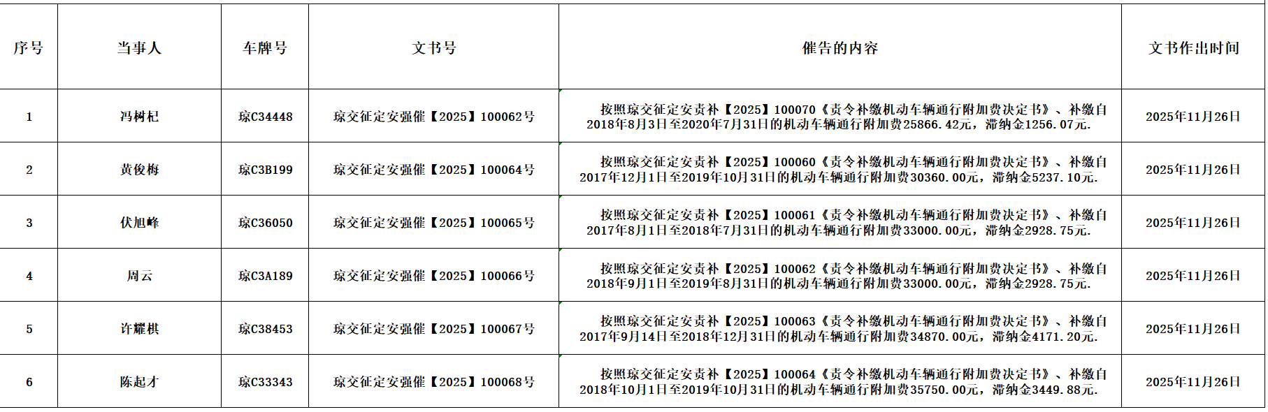 因下列当事人存在不按时缴纳机动车辆通行附加费的违法事实,本机关依法对下列当事人分别作出《责令补缴机动车辆通行附加费决定书》、《行政处罚决定书》并已依法送达下列当事人。下列当事人在法定期限内未申请行政复议亦未提起行政诉讼,又拒不履行行政决定;依据《中华人民共和国行政强制法》第五十四条的规定,现依法向你(单位)发出催告书,现因采取其他方式无法向下列当事人送达《履行行政决定催告书》,本机关特依法进行公告送达,自公告之日起经过30日即视为送达。请下列当事人自催告书送达之日起十日内按照《责令补缴机动车辆通行附加费决定书》、《行政处罚决定书》要求,将规费/罚款和加处罚款(逾期每日按罚款数额的3%计算)到定安县定城镇富民大道12号(海南省交通规费征稽局定安分局)处开具《海南省非税收入一般缴款书》,并按《海南省非税收入一般缴款书》要求进行缴款。逾期仍未履行义务的,本机关将依据《中华人民共和国行政强制法》第四十六条、第五十三条/《中华人民共和国行政处罚法》第七十二条的规定,向人民法院申请强制执行。