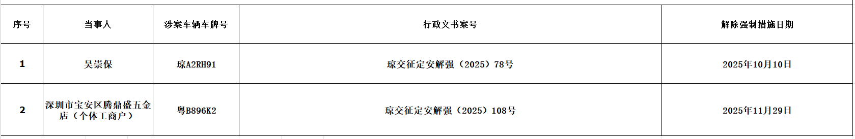 下列车辆因涉嫌偷漏机动车辆通行附加费或欠缴机动车辆通行附加费,我分局根据《海南经济特区机动车辆通行附加费征收管理条例》第三十七条的规定,对下列机动车辆(详见下面车辆明细)实施了暂扣措施。被我定安分局依法作出《行政强制措施决定书》采取了暂扣车辆的行政强制措施。现暂扣期限已届满,依据《中华人民共和国行政强制法》第二十八条第四款的规定,我分局已解除下列车辆的行政强制措施。请以上车辆的车主(单位)自公告送达之日起10日内,携带身份证原件(车辆所有人为单位的,携带加盖公章的营业执照复印件、委托书原件、代办人身份证原件)和车辆行驶证原件、机动车登记证原件到海南省交通规费征稽局定安分局(地址:定安县定城镇富民大道12号,联系电话:63822157。)办理车辆领取手续,逾期不办理的,我分局将对扣押车辆依法进行处置。因以上车辆的车主(单位)无法联系、下落不明,且我分局采取直接送达、邮寄送达、委托送达的方式均无法送达,现依法向以上车辆的车主(单位)公告送达《解除行政强制措施决定书》。本公告公告期为30日,公告期满视为送达。特此公告