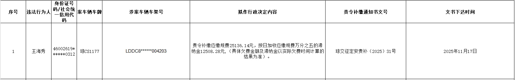 下列违法行为人因不缴纳机动车辆通行附加费(附名单),违反了《海南经济特区机动车辆通行附加费征收管理条例》第九条、第十一条的规定,被本机关依据《海南经济特区机动车辆通行附加费征收管理条例》第二十六条拟作出责令补缴决定。现因本机关采取其他方式无法送达,根据《中华人民共和国民事诉讼法》第九十五条之规定,特予以公告送达。公告期为30日,公告期满视为送达。自送达责令补缴决定书之日起,下列违法行为人应当在15日内到本机关补缴应缴规费并将罚款缴纳至海南省财政厅财政性资金帐户:265006188326(温馨提示:您(单位)如通过汇款的方式缴纳通行附加费、滞纳金,请按文书中的金额汇款,并在用途栏备注车牌号、车所有人、吨位,便于我局收缴入库处理)。下列交通违法行为人如不服本决定,可以自送达责令补缴决定书之日起60日内向海南省人民政府申请行政复议;或者在6个月内向定安县人民法院提起行政诉讼。