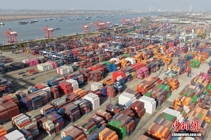 12月8日,航拍南京龙潭港进出口集装箱码头。当日,中国海关总署公布的最新数据显示,今年11月份,中国货物贸易增速回升,进出口总值3.9万亿元人民币,同比增长4.1%。(无人机照片) 中新社记者 泱波 摄