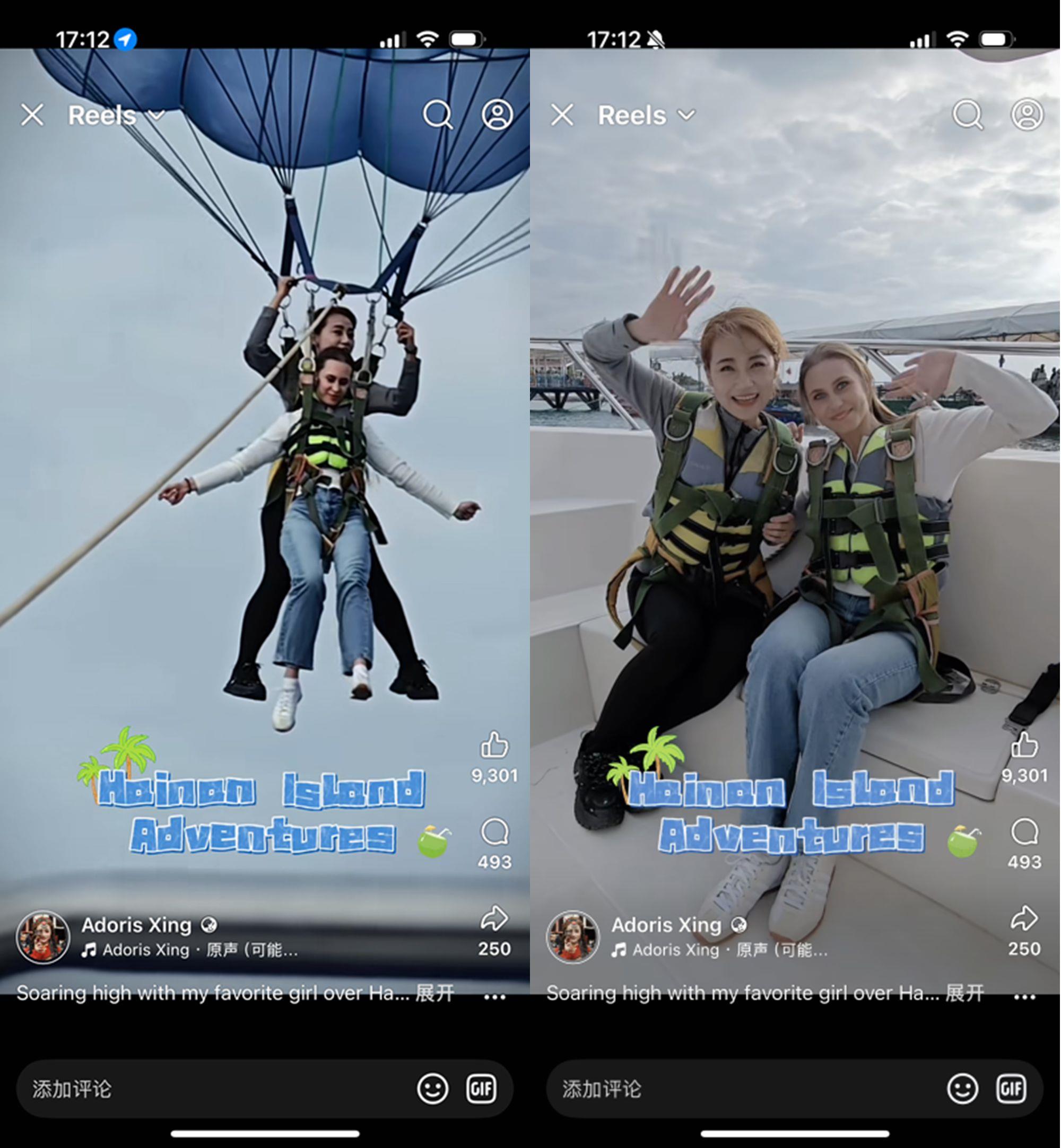 总台CGTN网红记者邢睿楠与在海南生活、具有较高海外粉丝基础的哈萨克斯坦网红博主Elena实地体验低空经济项目——拖曳伞飞行,从空中俯瞰海岛全景,以第一视角展现海南“海岛+低空+旅游”的创新融合模式。